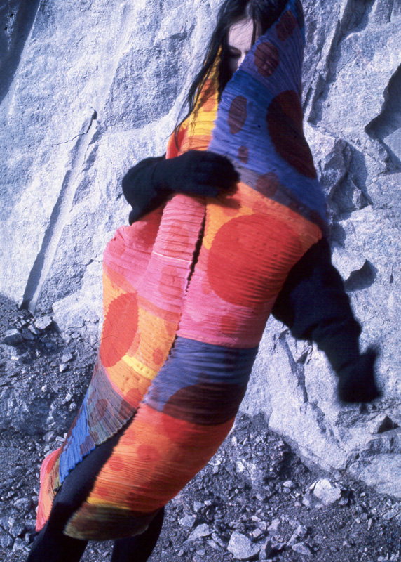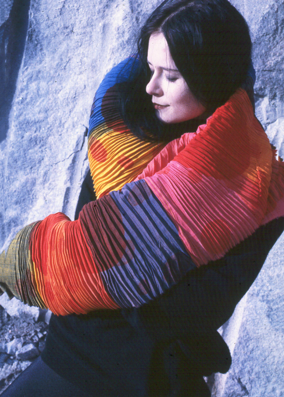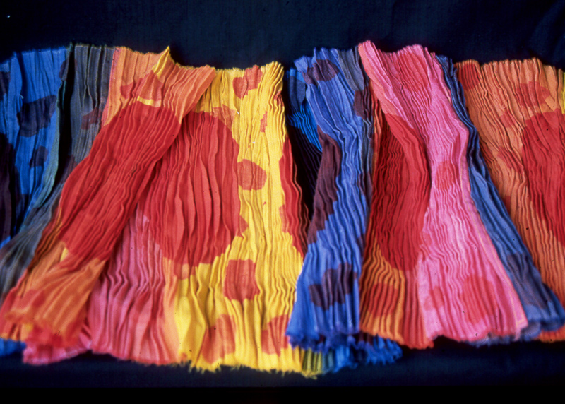 Painettu huivi on rypytetty shibori-tekniikalla.