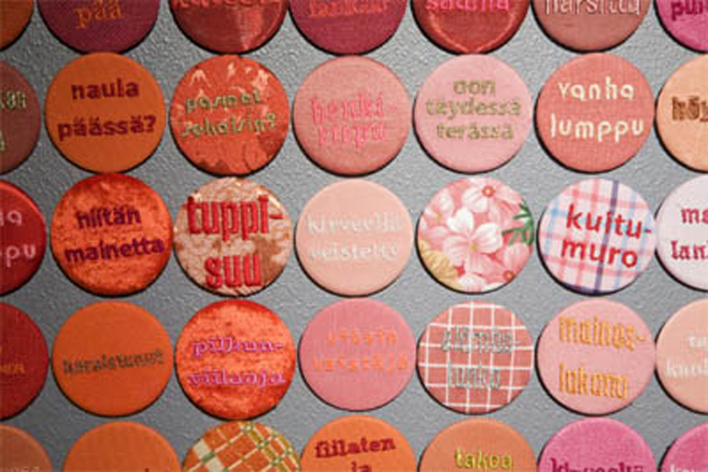 Pinssit on päällystetty kankailla, joihin on kirjottu ko. sanastoa. Pohjakankaissa on ajallista laajuutta, esim. vanhoja damasteja – laminoituja mikrokuitukankaita. Osassa pinsseistä ei ole tekstiä, mutta pinssi on päällystetty esim. ristipistotyöllä, käsinkudotulla pyyhekankaalla jne.