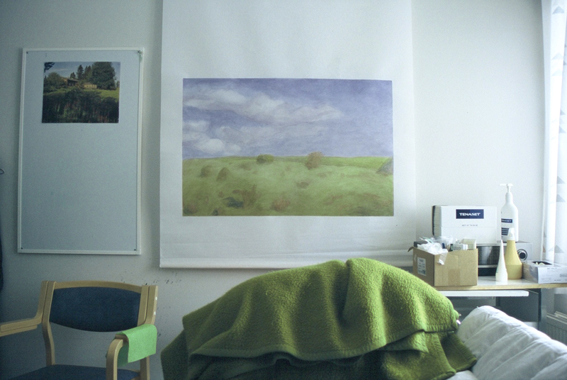 Alkuperäinen idea oli tehdä vaihdettavia, kattoon kiinnitettäviä maalauksia. Koetin kuitenkin asettua vuoteessa olijan asemaan ja minusta alkoi tuntua, että maalauksen näkyminen täytyy olla asukkaan kontrolloitavissa. Kuka haluaa tuijottaa samaa kuvaa jatkuvasti? Siksi valitsin maalauspohjaksi rullaverhon, jonka voi tarvittaessa päästää ylös tai vetää näkyviin. Kuvat ovat vaihdettavia ja melko helposti liikuteltavia. Rullaverhot voidaan kiinnittää olemassa oleviin rakenteisiin kuten verhokiskoihin tai käyttämättömiin nostolaitteisiin.