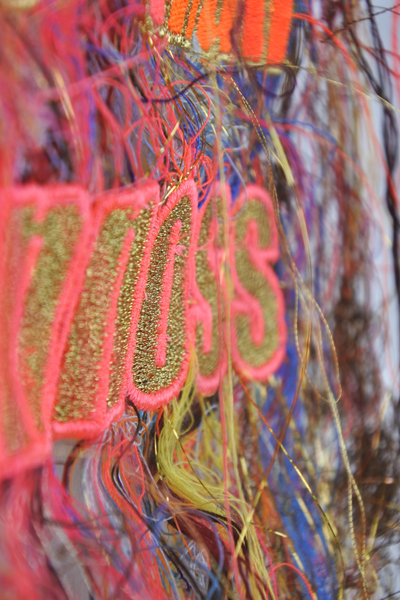 Joo ihan kunnoss, 2022 Materiaalit: hävikkimateriaalit, uv-langat, kulta Tekniikka: digitaalinen kirjonta, kollaasi Koko (lks): 40 cm x 62 cm x 5 cm