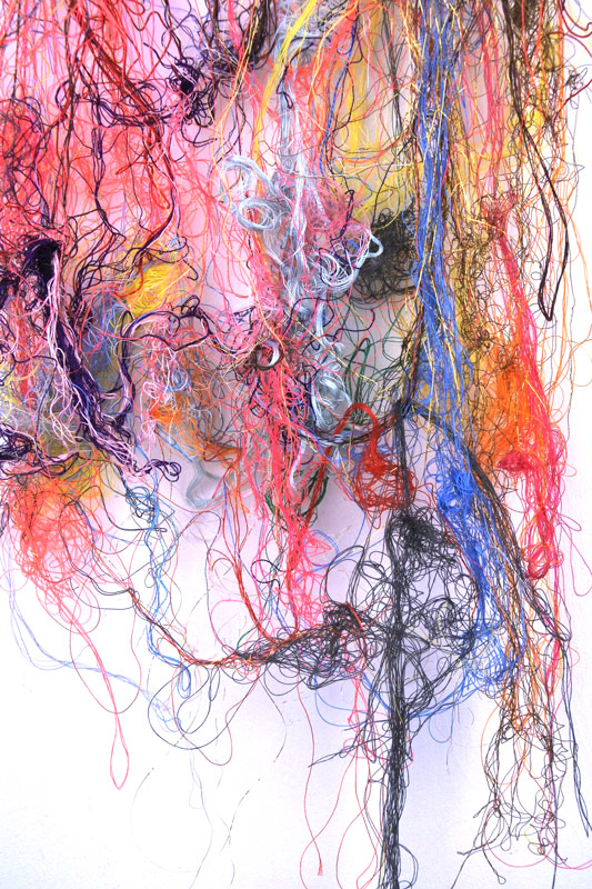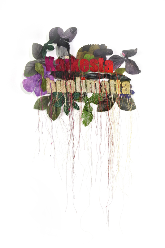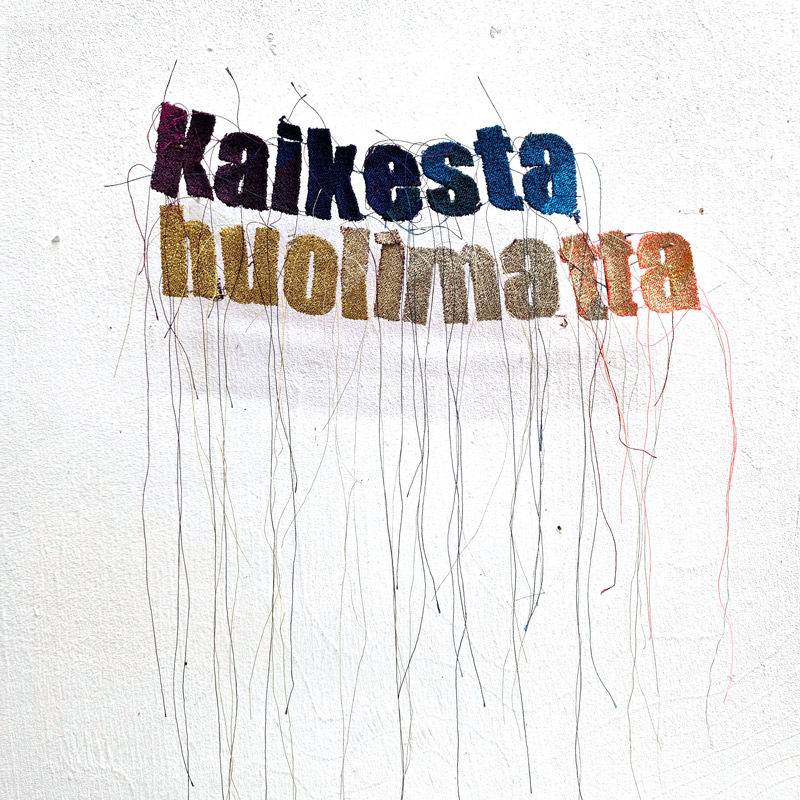 Kaikesta huolimatta, 2022. Materiaalit: hävikkimateriaalit, polyamidi, kulta 18K Tekniikka: digitaalinen kirjonta, kollaasi, värjäys Koko (lks): 35 cm x 45 cm x 5 cm