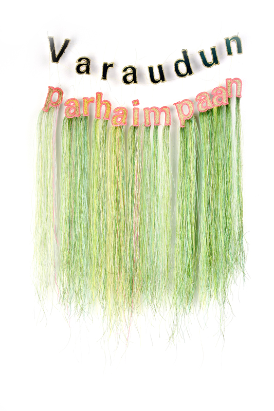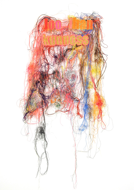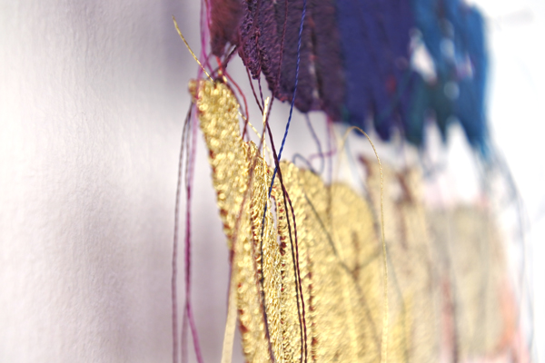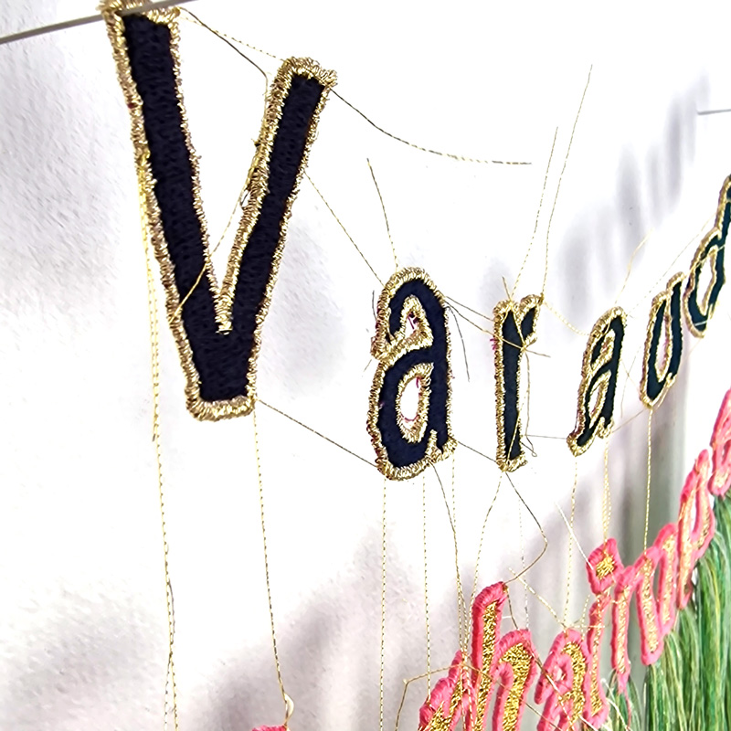 Varaudun parhaimpaan, 2023. Materiaalit: silkki, kulta 18K, polyamidi. Tekniikka: digitaalinen konekirjonta, käsinkirjonta.