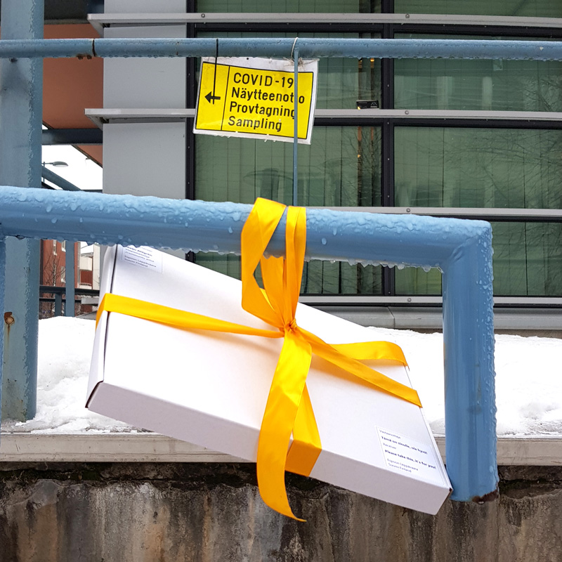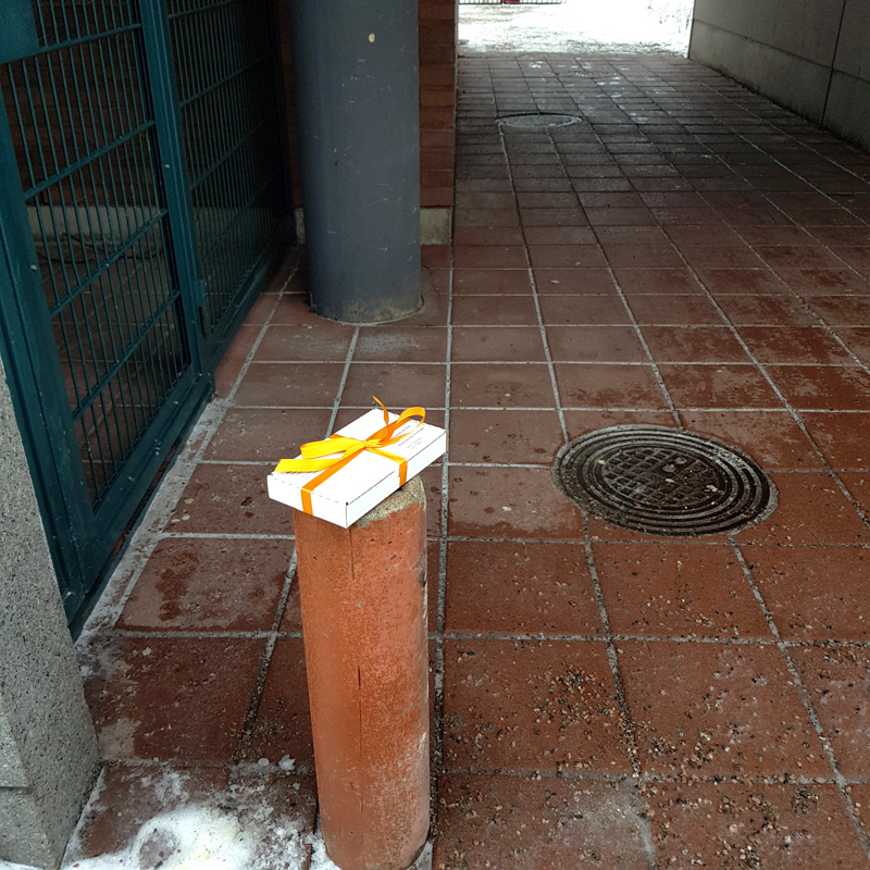 Pakkasin lapaset postituslaatikoihin. Teoksen avajaiset olivat 22.2.2021, kun jätin laatikot katutilaan Espoon Leppävaarassa. Löytäjä saa pitää!