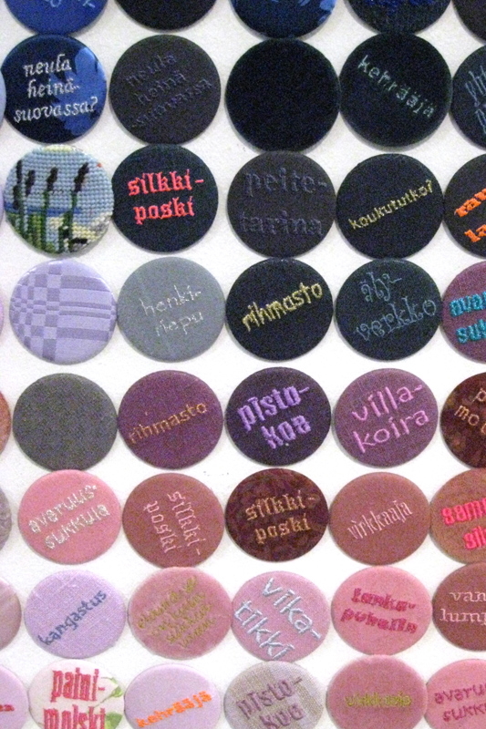Pinssit on päällystetty kankailla, joihin on kirjottu ko. sanastoa. Pohjakankaissa on ajallista laajuutta, esim. vanhoja damasteja – laminoituja mikrokuitukankaita. Osassa pinsseistä ei ole tekstiä, mutta pinssi on päällystetty esim. ristipistotyöllä, käsinkudotulla pyyhekankaalla jne.